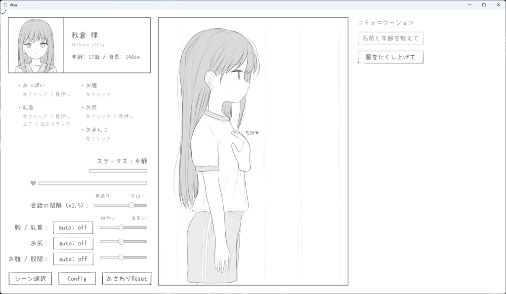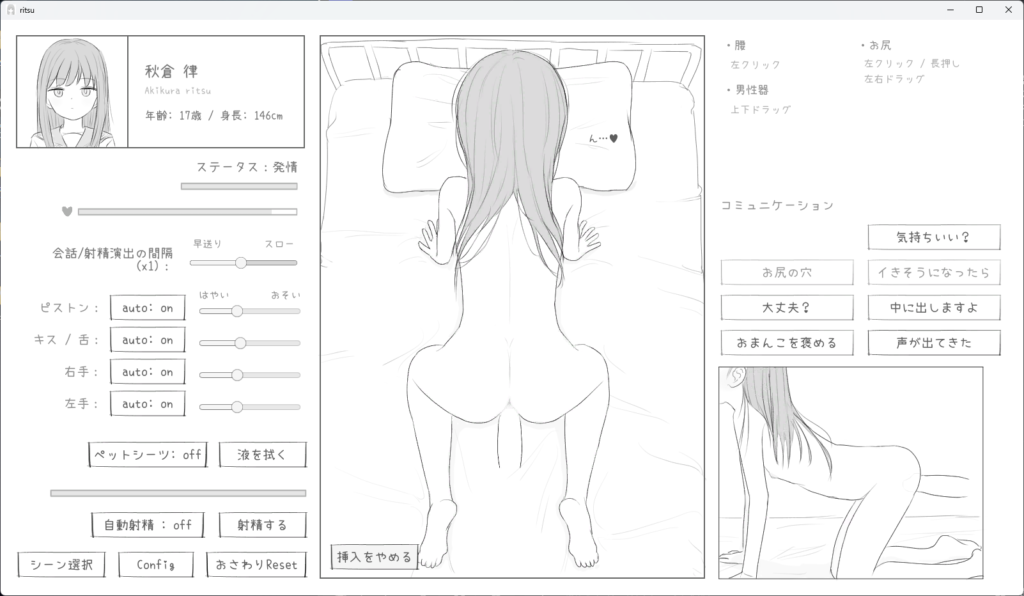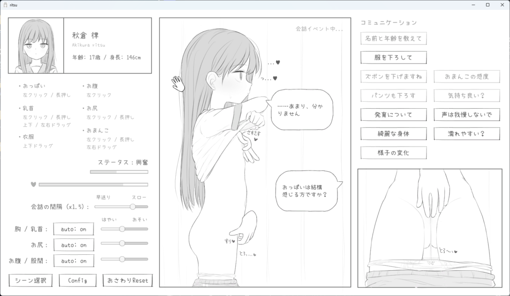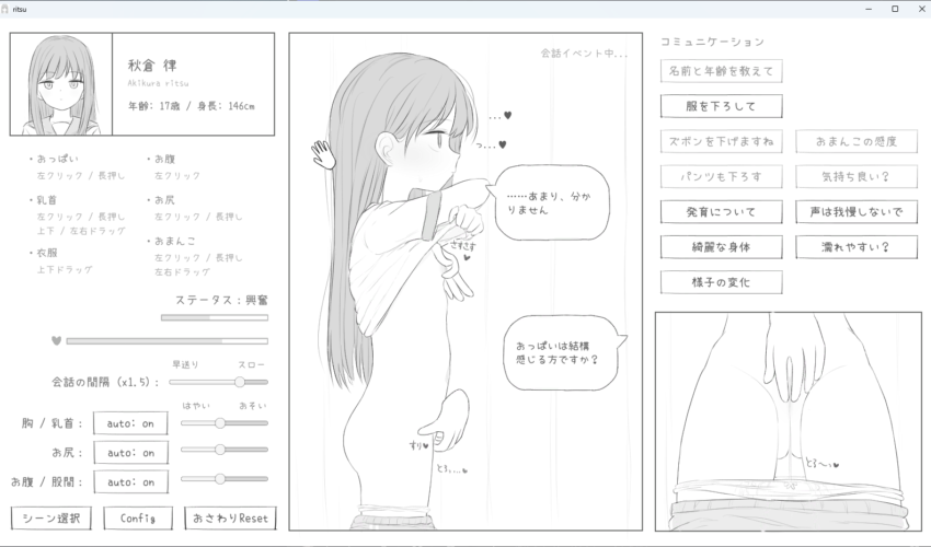 ところが、どっこいしょ。令和ナイズドされたエロフラである本作は、会話のイベントシーンは基本一度クリックすれば自動再生。おさわり機能やピストンに関しても、一度クリックすれば、後は設定した速さでautoで動いてくれるという。至極単純なようでいて、こういう部分がユーザーフレンドリーなのが、いいゲームとそうでないゲームとを分ける、なんだかんだ大事な部分だと筆者は思っております。